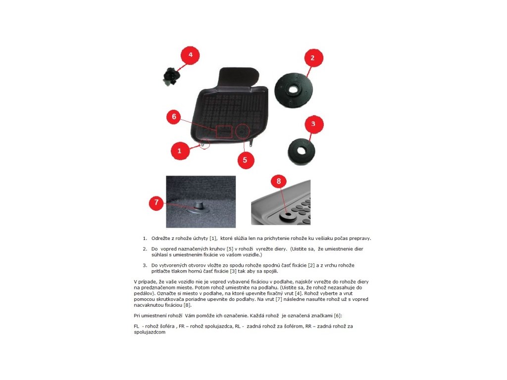 Jednoducho položíš na podlahu. Ak má auto originálne úchyty, rohože zacvakni pre pevné uchytenie. Pred prvou jazdou skontroluj, že nič neprekáža pedálom.