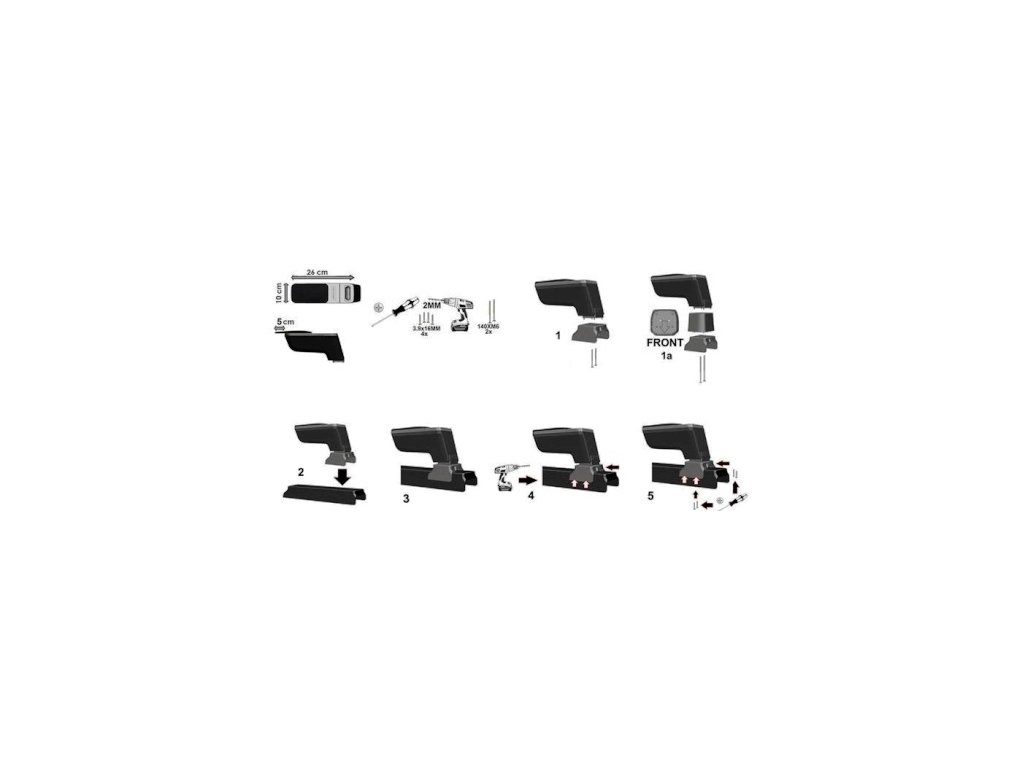 Lakťová opierka  pozostáva z dvoch častí - základne a vrchnej časti. Základňa je pripevnená pomocou adaptérov. Opierka je plne nastaviteľná a je dodávaná s presnými montážnymi adaptérmi na montáž pre zvolený typ auta.